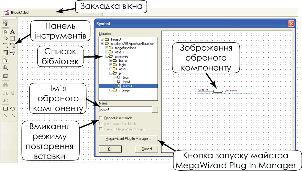 Всі вікна в Quartus Prime містять закладки, подібні закладкам аркуша в Microsoft Excel. Активна закладка має більш темні кольори. Ліворуч від вікна графічного редактора розташована панель інструментів. Закладка може розташовуватись і окремо від загального вікна пакету Quartus II. Для цього необхідно натиснути кнопку прив’язки вікна. Для повернення вікна назад, до загального вікна пакету необхідно натиснути кнопку прив’язки ще раз.