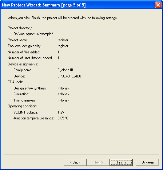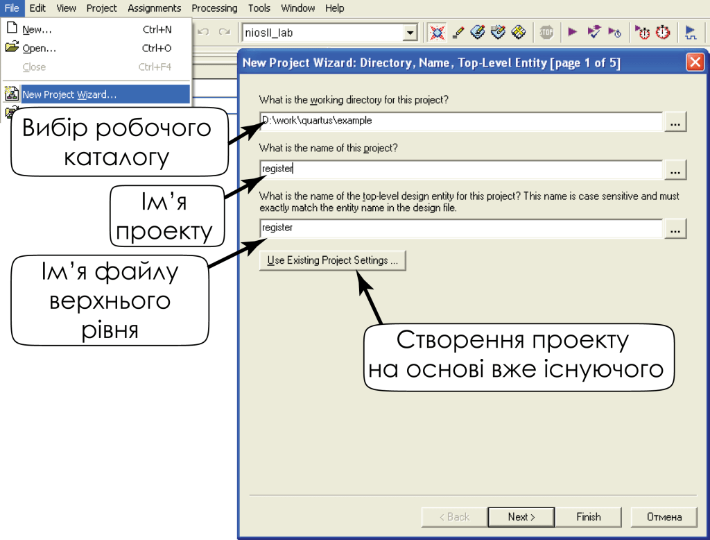 - New Quartus PrimeProject – створення нового проекту.