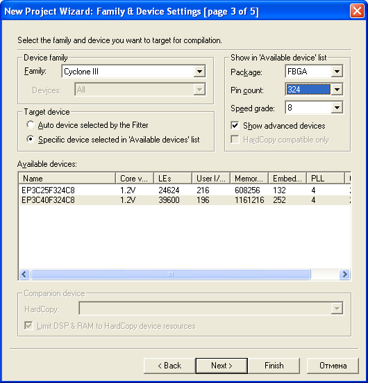 Target device – вибір мікросхеми: