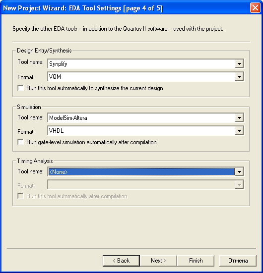 В цьому вікні робиться вибір додаткових засобів налагодження, верифікації та синтезу проекту. Оскільки при роботі буде використовуватися тільки пакет Quartus II, тому додаткові засоби проектування визначати не будемо.