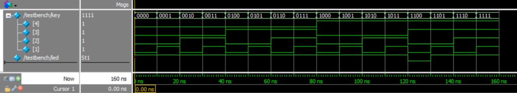 Формат чисел, що подаються на входи, наступний: 4‘b0000. Це означає, що 4-бітний вектор з усіма бітами, рівними 0. 4‘b1111 відповідає 4-бітного вектору зі значенням 1111 в бінарному вигляді. Синтаксис «#» використовується для вказівки затримки. Це означає, що спочатку сигнал «key» буде встановлено в значення «0000». Потім (після затримки в 10 одиниць модельного часу) буде виконана наступна по порядку команда.